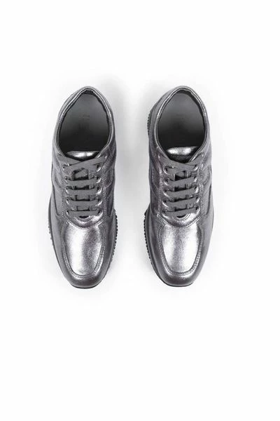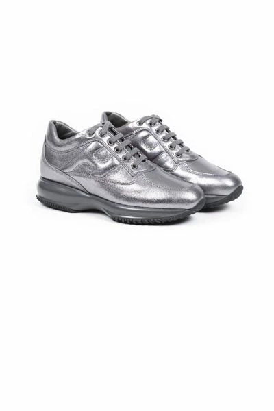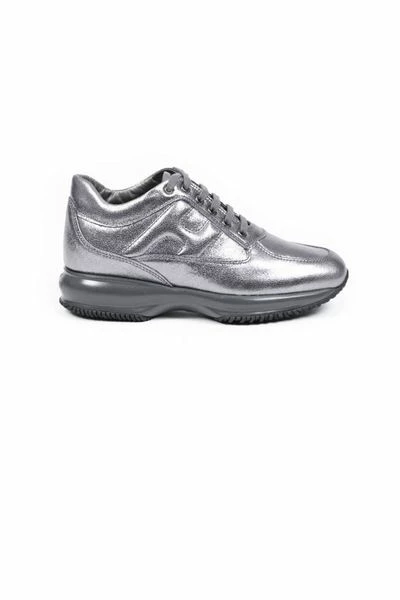 Womens Shoes Collection Trendy zilvergrijs Interactive sneakers in metallic kalfsleer van Hogan voor vrouwen met uitsnijdingen en H-logo op de zijkant. De veters zijn tone-on-tone grijs. De zool is oversized in grijs rubber.