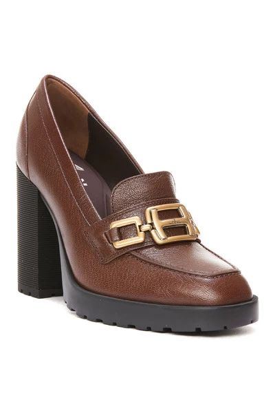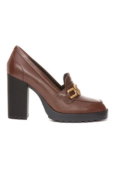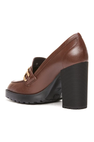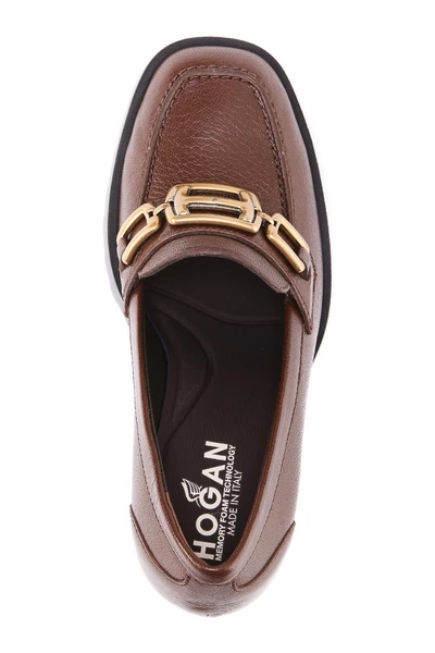 Hogan Brown Woman Heeled Loafers, H623 Model, logo, ketting, leer. Hiel: 10 cm