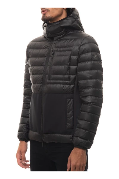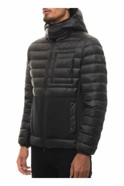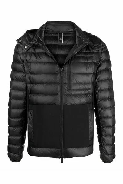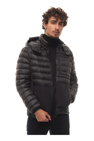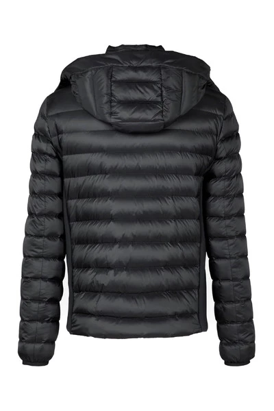 Donsjack met capuchon, afneembare capuchon, bimateriaal, armembleem, dubbele ritssluiting, made in italy, slim fit, kleur: zwart, merk: HOGAN, model draagt maat S – lengte model: 185