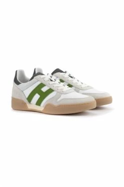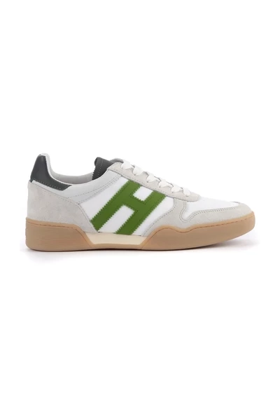 Hogan H357 Sneaker in wit suède met groen leer H. Canvas inzetstukken. Blauwe lederen spoiler van 1,5 cm, uitneembaar binnenwerk.
