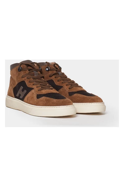 Hogan H365 basketbaltrainer van bruin suède en technische stof. Uitneembaar anatomisch voetbed. Comfortabele pasvorm. Leren voering.