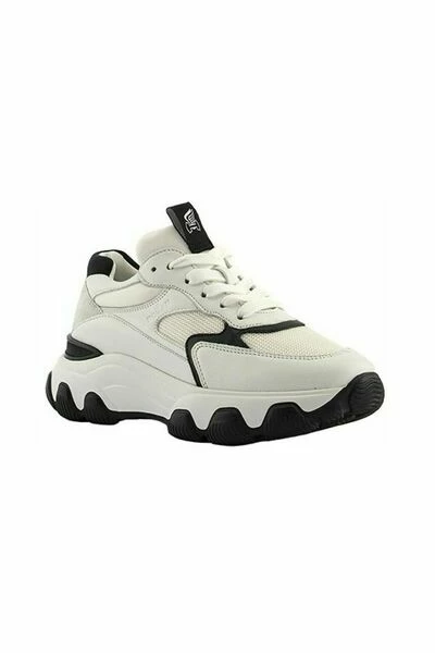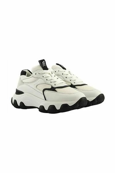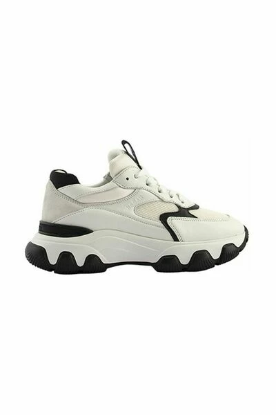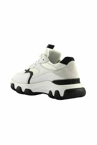 Hyperactive sneakers van Hogan. Witte low top sneakers van leer en technische stof met zwarte details. Voorzien van nieuwe, extra lichte, grove, rubberen zool, memory foam voetbed en Hogan logo in reliëf op de zijkanten.