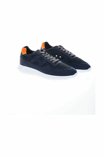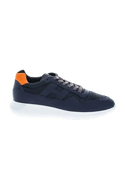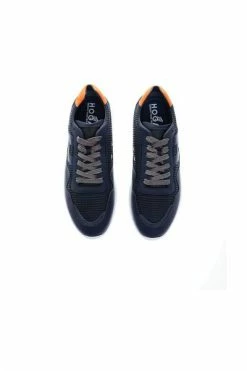Collectie Schoenen AH19 / 20 Trainers marineblauw Ik Cube in kuit gegomd en Hogan net. Model licht met uitsnijdingen H toegepast en steunpilaar oranje. Van veters tweekleurig are ontmoette één kamer verwisselbaar paar. De witte zool van rubber en het meten hiel 4, 5 cm.