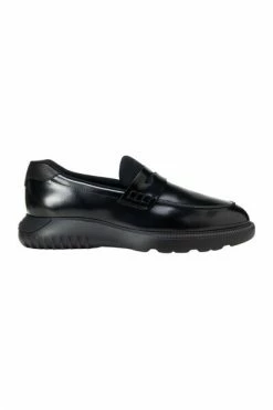 Hogan platte schoenen zwarte mocassin gemaakt van schurend leer met duikachtige effectenstof en korrelige lederen details. Logo-geëmbossed gevoerde teen dop en tong. Blootgestelde topstitching, traagschuim voetbed en extralight Eva Sole.