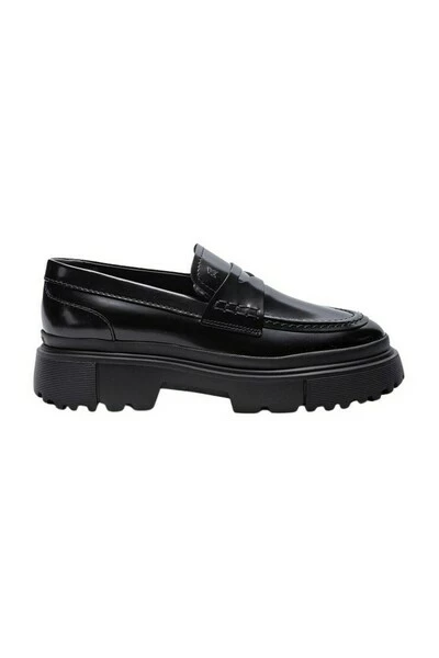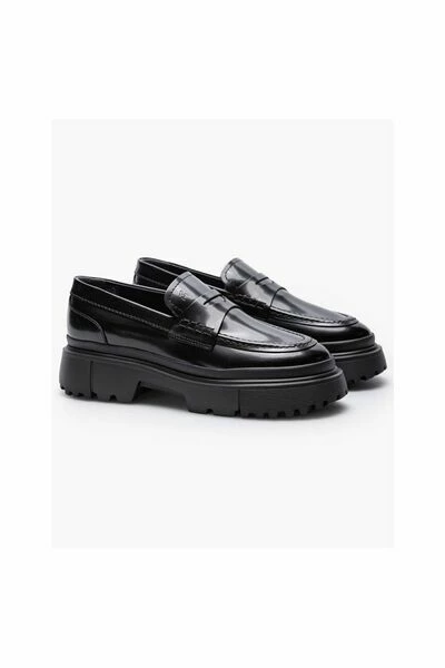 Verzameling dames zwarte mocassins schoenen in Glace Leated, Hogan for Women. De mocassin heeft een decoratieve poot en een stikplaat. De zeer lichte zool bevindt zich in ingekapte gum met kleine H. De hiel meet 4,5 cm.