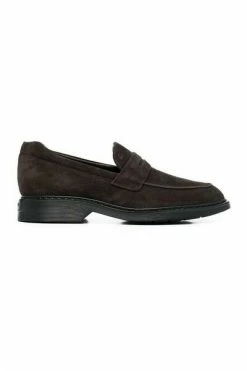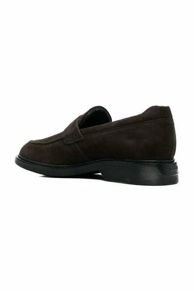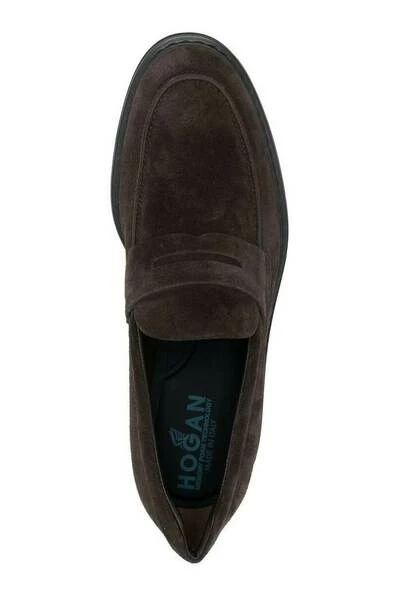 Hogan logo-geëmsteerde suède loafers van Hogan met bruin, kalf leer, suede, logo-geëmbossed tong, penny slot, amandel teen, slip-on stijl, merkbelang en lage gestapelde hiel.