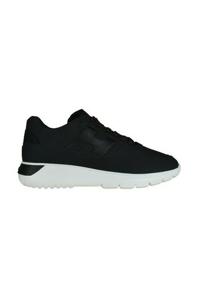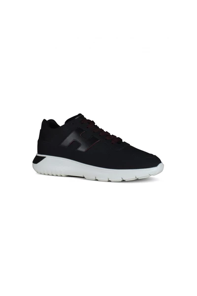 Hogan Interactive 3 sneakers van glad zwart leer met bordeauxrode veters, witte rubberen zool, H-logo opzij en uitneembare schuimrubberen binnenzool.