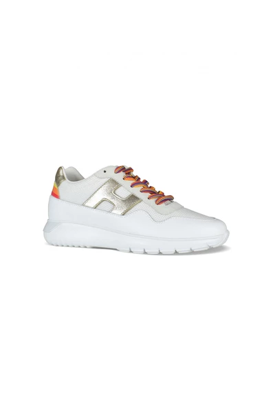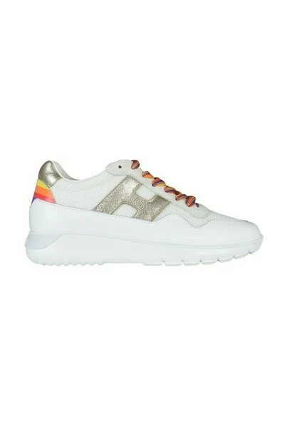 Interactive 3 sneakers Hogan wit .Leer en technische stof. H-logo en gouden leren teller. Veelkleurige veters.