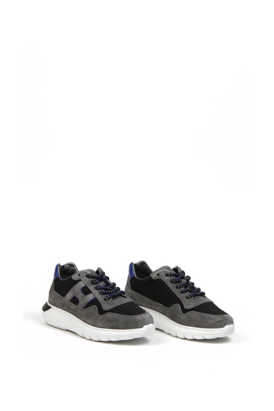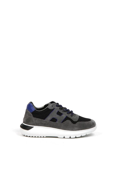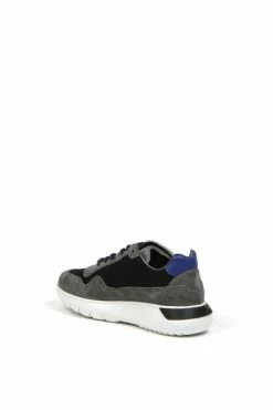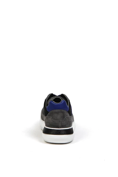 Bovenwerk van stof en leer, witte rubberen zool. Grijze logoband aan de zijkant.