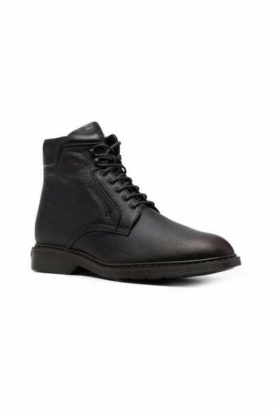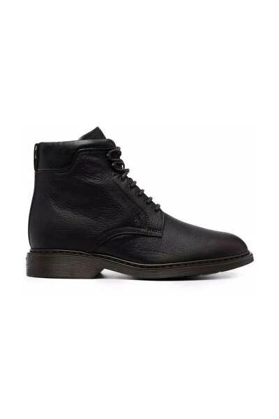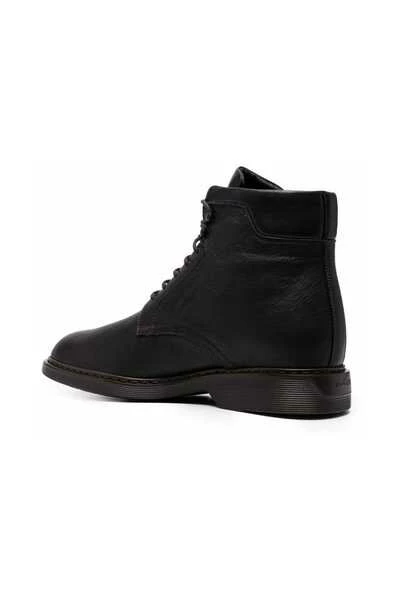 Hogan Laarzen Bruin Zwart lederen enkellaarsjes van HOGAN met ronde neus, platte lederen zool, vetersluiting aan de voorkant, merkbinnenzool, enkellange lengte en mat effect.
