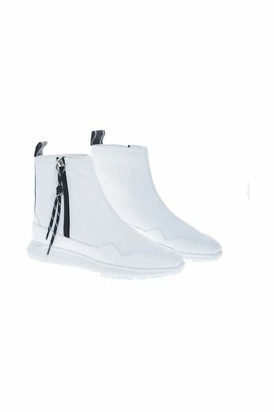 Collectie Schoenen AH19 / 20 witte laarzen I-Cube Hogan met rits aan de zijkant versierd met een dia met two-tone kant. Een strook weefsel wordt toegepast op de gehele breedte van de achterzijde van de schoen met geborduurd opschrift over geld Wij luxe sport sinds 1986. De zool is enigszins tandvlees en de hiel is 5 cm.