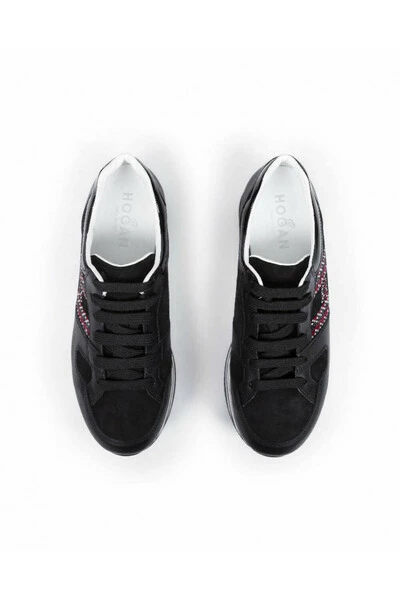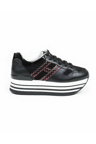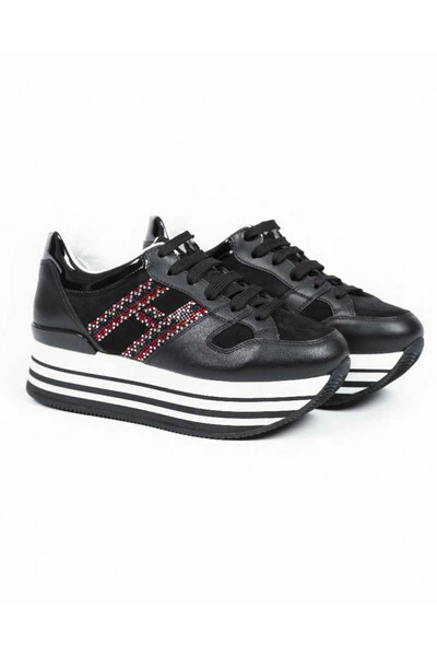 Verzameling damesschoenen Maximale Hogan Sneakers voor vrouwen in leer en suede met sneden en rood en wit H geborduurd logo aan de zijkant. Het platform bevindt zich in zwart -witte kauwgom.