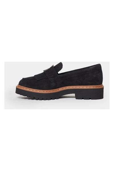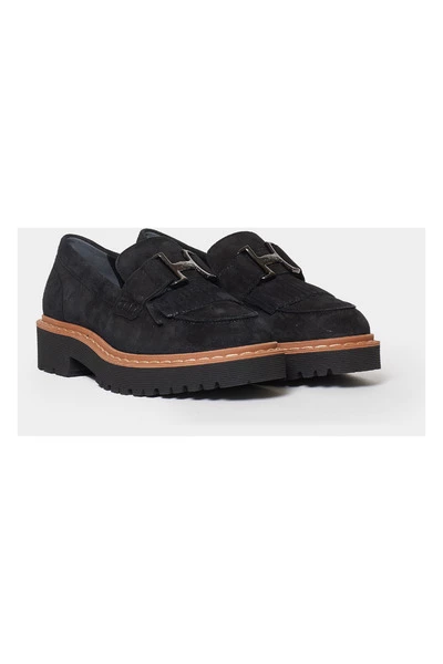 Hogan Moccasin met Fringe in zacht zwart suède. H-logo in zwart metaal. Ultra-light rubberen zool met lederen looklet. Interne plantar in verwijderbaar geheugenschuim. Normale pasvorm. 3 cm hak.