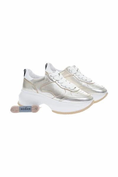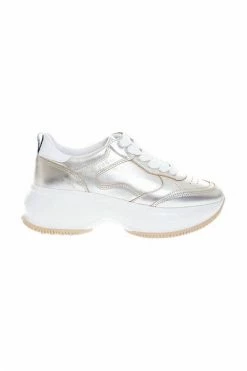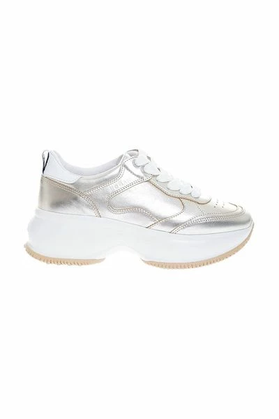Damesschoenencollectie Hogan Maxi active metallic platina sneakers, een model met veel uitsparingen. De zool is van wit rubber. De hak is 6 cm hoog. Materiaal: textiel, kalfsleer Binnenzool: leer Voering: textielmateriaal Zool: rubber Productstijl-ID: HXW4350BN50I81 Deze beschrijving is automatisch vertaald.