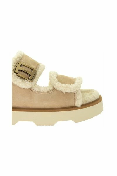 Voor degenen die niet in de winter de gemakkelijke chique look van de sandaal afzien, combineert dit must-have-model lichtheid en een verfijnde gezellige smaak. Gemaakt van suède, met leidingen en faux bont voering, wordt het verrijkt door het aangepaste metaal H -accessoire. De Eva Sole heeft brede, door wang geïnspireerde groeven.- Personaliseerd metal H-accessoire