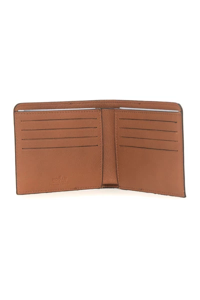 Portemonnee, hamerleder, logo vooraan, kaarthoudervakken, binnenin: bankbiljettenvak, tweekleurig, samenstelling: 100% leer, merk: HOGAN.Afmetingen: 11x10x1cm.