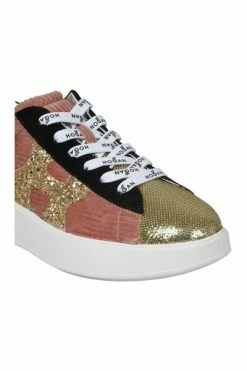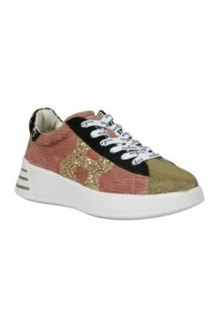 Hogan Rebel Sneakers, Corduroy met contrastinfg inserts. – Limited Edition Hogan X Papini – FW22 – Round Sequin Toe – Logo Print Lace Up – Side Glitter H Monogram – Ponyfur Back Insert – Plat Rubber Sole (A: 5 cm) – Made in Italy – Fabric