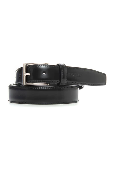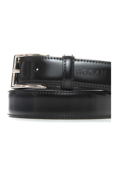 Leather belt, silver buckle, the length can be modified by cutting the belt, raised logo, glossy effect, composition: 100% leather, brand: HOGAN.