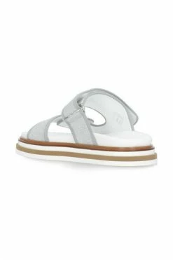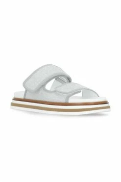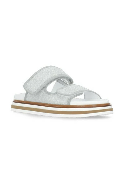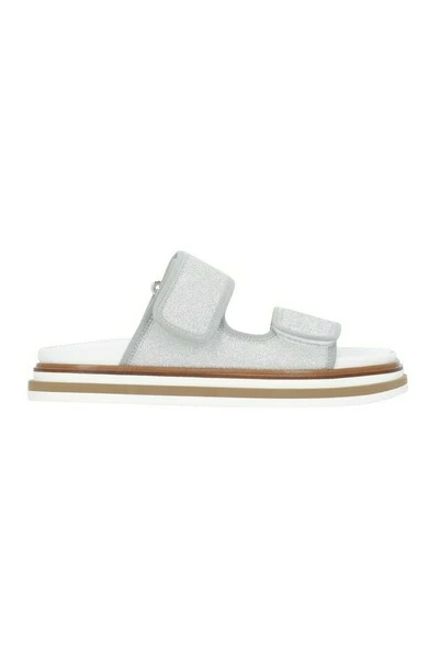 Hogan Sandals Silver- Hogan Silver Leather Sandalen voor vrouw- voorste banden met stretch bevestigen- asymmetrische bovenste steken- All-over glitter-rubberen zool