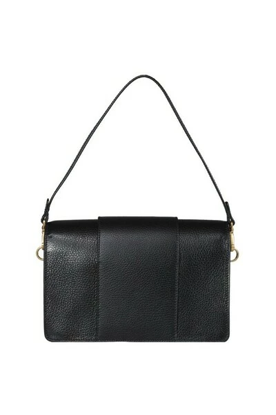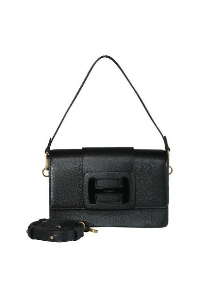 Zwart lederen h-bag schoudertas van Hogan met korrelige textuur, tonale logo-plaquette, reliëflogo aan de voorkant, goudkleurige hardware, enkele afneembare schouderband, vouwtop met magnetisch bevestiging, gepartitioneerde compartiment en interne slipzak.