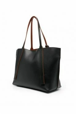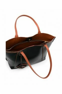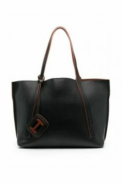 Hogan-tassen .. Zwart contrast-linerende draagtas van Hogan met zwart, bruin, leer, tweekleurig ontwerp, logo-tag, twee lange handgrepen en bovenste ritssluiting.