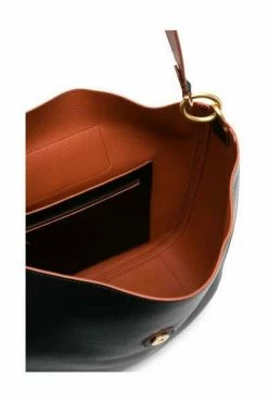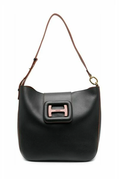 Hogan-tassen .. Zwarte logo-plaque schoudertas van Hogan met zwarte, logo-plaquette, kiezelstenen, vouwtop, hoofdcompartiment en enkele schouderriem.