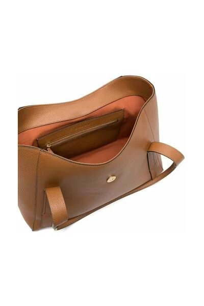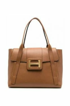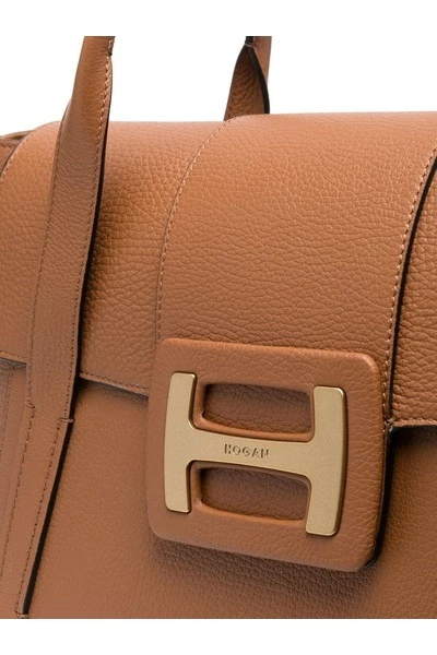Hogan-tassen .. logo-plaque draagtas van Hogan met bruine, lederen, goudkleurige logo-plaquette, vouwtop, twee gerolde bovenste handgrepen en interne zip-fasterende zak.