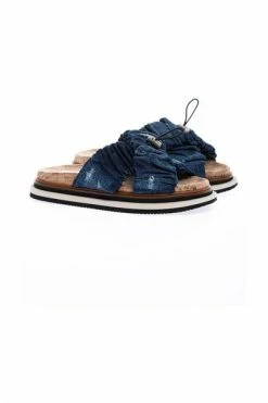 Schoenen verzameling Blue Hogan sandalen met 2 brede kruisband Gewassen denim veren (uitstekend effect) met het midden een accessoire met schuif en elastisch. De zool is rubber met platte lederen welt. Van Binnenzijde is gerecupereerd in Cork.