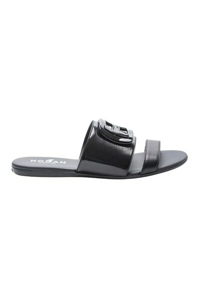 Muiltjes van zwart kalfsleer met twee strepen en bakelieten logo, van Hogan voor dames. De zool is van rubber. Materiaal: Bovenwerk van lakleer en glad leer Leren binnenzool Rubberen buitenzool Productstijl-ID: HXW1330EC40R3MB999 Deze beschrijving is automatisch vertaald.