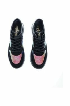 Schoenen collectie Womens FW19 / 20 Aantal / tennis black Active One by Hogan met meerdere uitsparingen, pailletten inzetstukken en verschillende materialen met een veelkleurige verschijning. De zool is zwart rubber en de hiel (binnen + buiten) een hoogte van 5 cm.