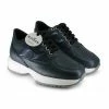 Womens Shoes Collection Trendy marineblauwblauw sneakers Actief One in kalfsleer en splitleer van Hogan voor vrouwen geperforeerd met pailletten. De zool is wit rubber met grijze inzetstukken en de hiel maatregelen 5cm.