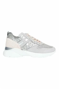 Womens Shoes Collection Silver Active One sneakers in kalfsleer en splitleer van Hogan geperforeerd met pailletten. De zool is wit rubber met grijze inzetstukken en de hiel maatregelen 5cm.