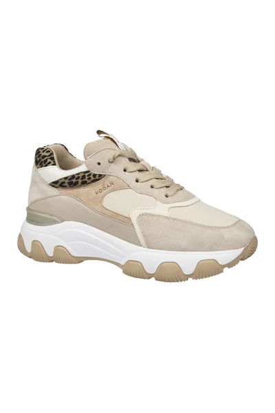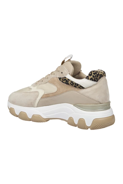 Hyperactieve sneakers in beige kleur met groene details. Contrasterende rugpatch en traagschuim voetbed. Samenstelling: suede, leer en textielvezel. Rubberen zool. Enige hoogte: 6,2 cm. Gemaakt in Italië.