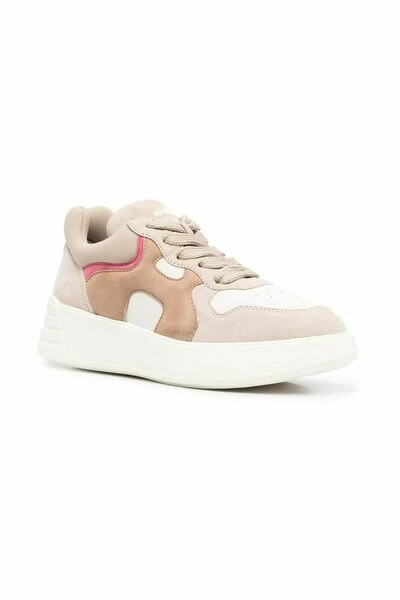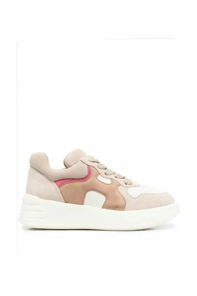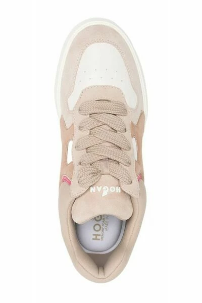 Low-top sneakers van Hogan met beige, wit kalfsleer, lambrisering, logopatch opzij, ronde teen, vetersluiting voor, tong met logoprint, merkzool en platte rubberen zool.