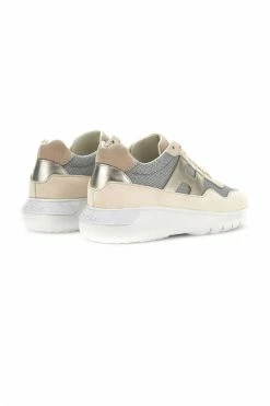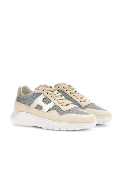 Hogan beige interactieve sneakers suède bovenste glanzende technische stof inzetstukken gemetalliseerde lederen zijde h verwijderbare interne voetbed 1,5 cm rubberen zool totale hoogte 5 cm