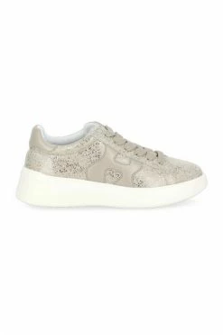Hogan Beige – Hogan lederen sneakers voor vrouw – suede lederen ronde teen – front lurex veters bevestiging – suède lederen bovenste hak – zijkant suède leer iconisch h – gevestigd patroon – verhoogde rubberen zool (4 cm)