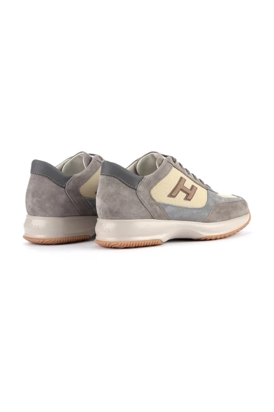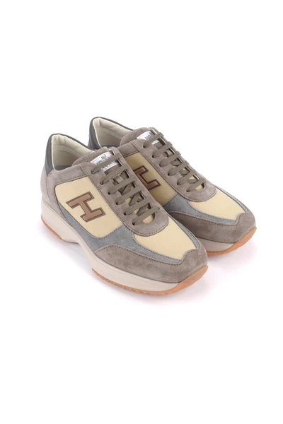 Hogan Sneaker New Interactive H -kudde model in Sue Chamois en Beige Fabric. Grijze details. Interne fussbett in verwijderbaar leer 2 cm. Rubberzool 3,5 cm.
