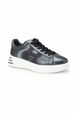 Hogan sneakers zwarte sneakers met lederen bovenste en parelafwerking. Glitter Side H met metalen lederen details. Memory Foam voetbed en rubberen zool met handgeschilderde strepen. Gemaakt in Italië.