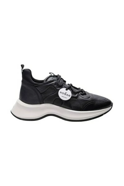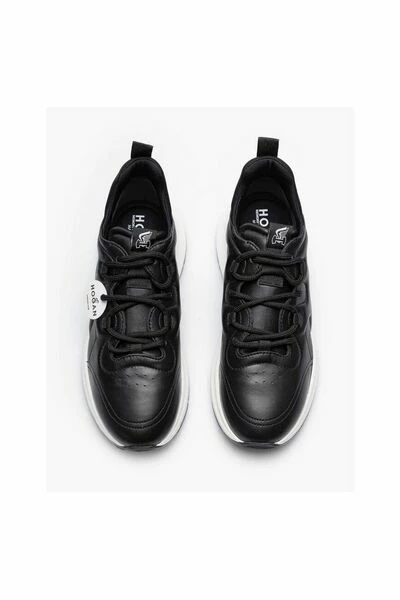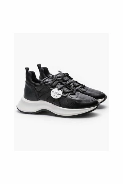 Collectie damesschoenen sneakers – Speedy Run – Black Hogan Nappa Leather for Women. De sneakers zijn versierd met stiksels, terwijl het H -logo aan de zijkant is gewatteerd en koppig. De zool is dik voor een betere demping. De hiel meet 4,5 cm.
