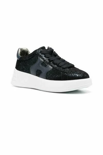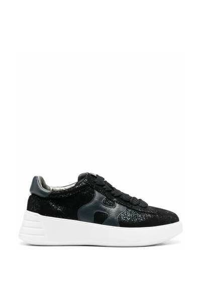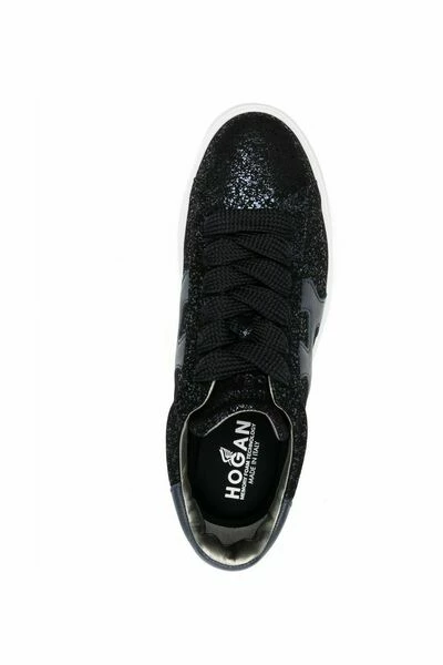 Hogan Sneakers Black Glitter Logo-Patch dikke sneakers van Hogan met zwart/wit, kalf leer, glitterdetails, logo-patch aan de zijkant, ronde teen, vooraanvatten, merkbeleggingen en dikke rubberen zool.