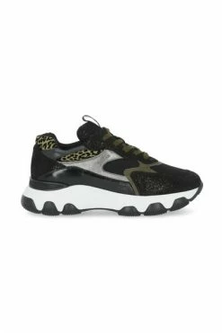 Hogan Sneakers Black – Black Hogan Suede gelamineerde lederen sneakers voor vrouw – Tech Fabric en metalen lederen inzetstukken – Suede leer en ingebouwde stofdetails met dierentienpatroon – Ronde teen – voorste contrasterende kleurvakjes bevestiging – zij in reliëf Hogan – Gros Grain Tab met Hogan Monogram At Tong – Intern traagschuim Fussbett – verhoogde rubberen zool (5 cm) – Verkocht met reserveveteres