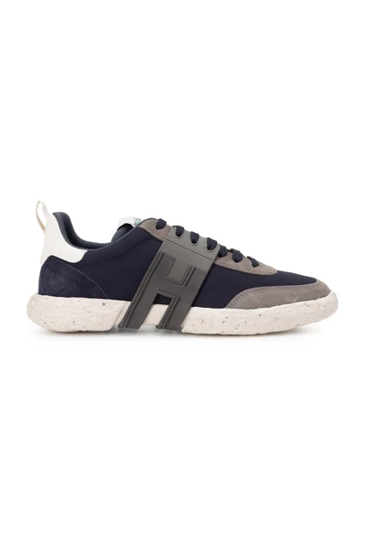 Hogan sneakers recyclen – hergebruik – verminderen. Hogan-3R sneakers met Ultralight Sole, die gerecyclede materialen omvat, gekenmerkt door de circulariteit van het Maxi Rubber H-logo. Bovenwerk van canvas met behulp van gerecyclede vezels. Suede inserts.