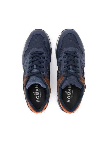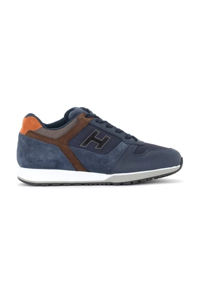 Hogan H321 sneaker blauw en bruin leer en gaas met oranje details. Stoffen voering 3,5 cm rubberen zool in Italië