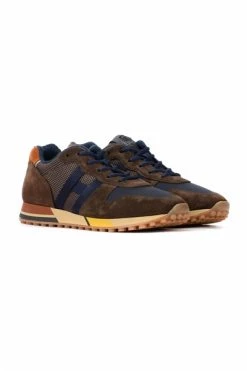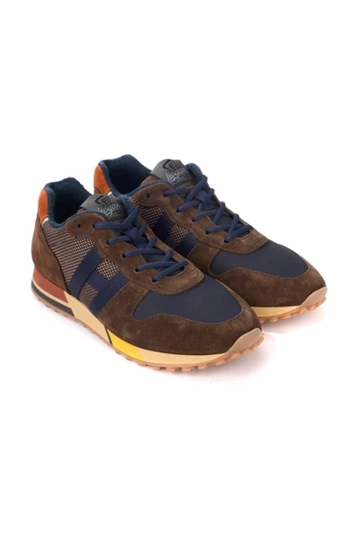 Hogan Sneaker H383 Bruin en blauw model gemaakt van leer en technische stof. Suède lederen bovenste Nabuk -inzetstukken in rubberen zool 4 cm gemaakt in Italië