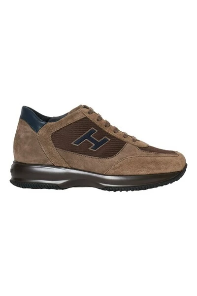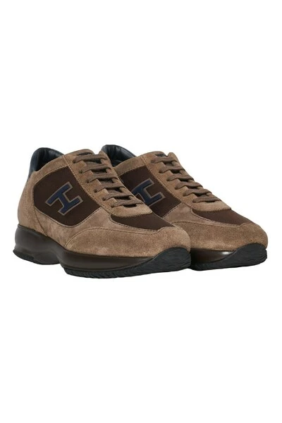 Hogan interactieve sneaker met suède bovenste en hazelnoot technische stof. Plantage verwijderbaar 2 cm. Rubberen zool. Wijd zittend.