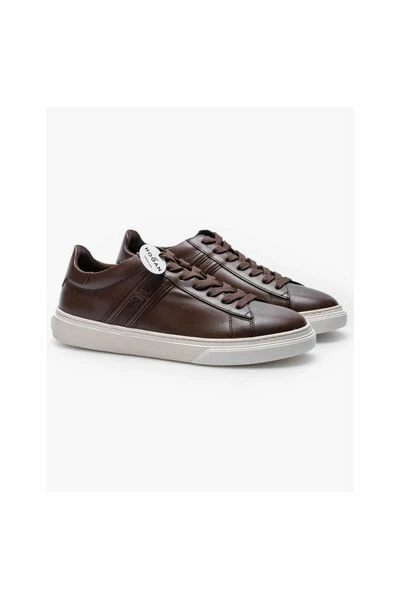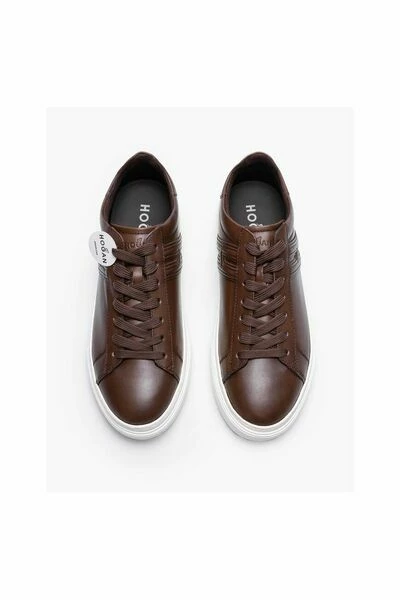 Collection herenschoenen bruine sneakers in zeer licht en dun gepatineerd leer leer – H365 – Hogan voor mannen met de spijkerbroek en de H toegepast in reliëf aan de zijkant. De zool is in witte kauwgom. De hiel meet 3 cm. Dit product is in het VK -grootte.