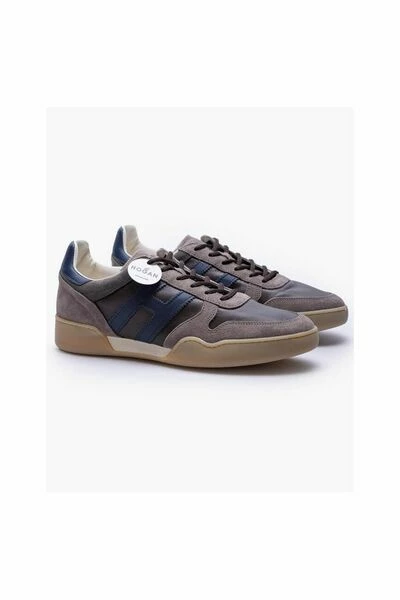Collectie herenschoenen bruin, blauw en beige sneakers – retro -volleybal – vintage nappa leer en lederen korst, hogan voor mannen. De zool bevindt zich in het honinggerichte tijdperk.