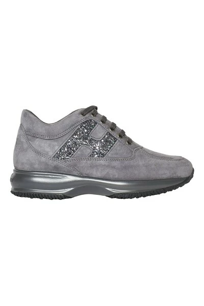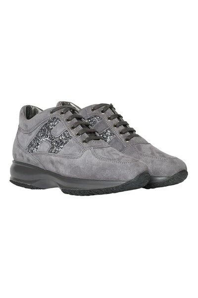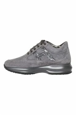 Hogan Interactive Sneaker, tijdloos pictogram. Gray Suede -versie met H Strass. Fussbett verwijderbaar van 1,2 cm. Totale hoogte 5,7 cm. Breed fit, het wordt aanbevolen om een ​​half nummer minder te bestellen.