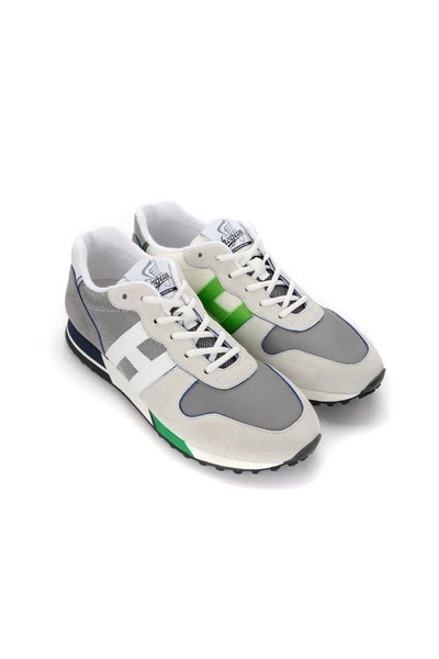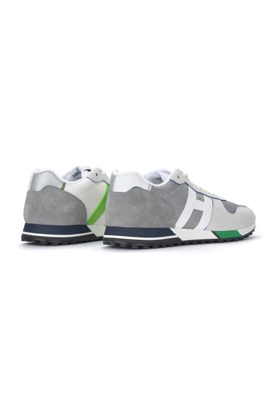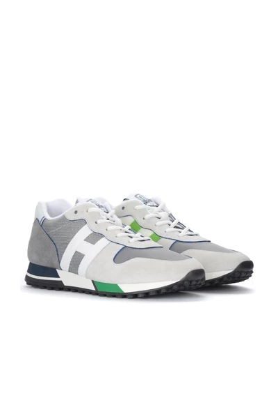 Hogan Sneaker H383 grijs model met lederen details en technische stof. H lateraal in Gogrè Bicolor gemaakt in Italië