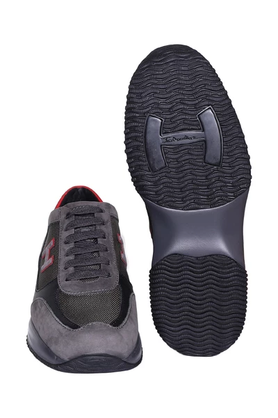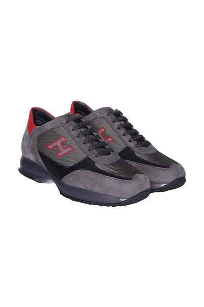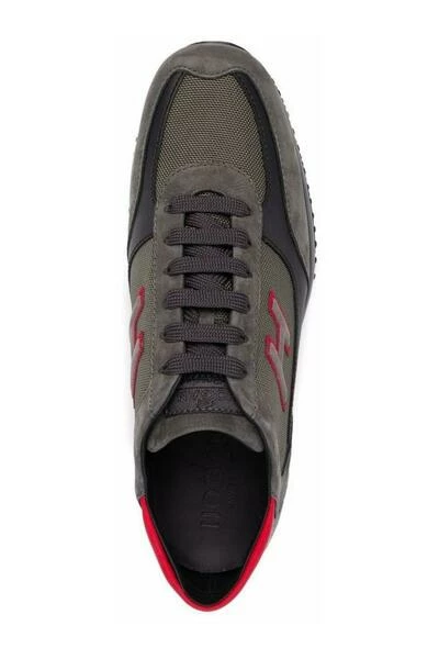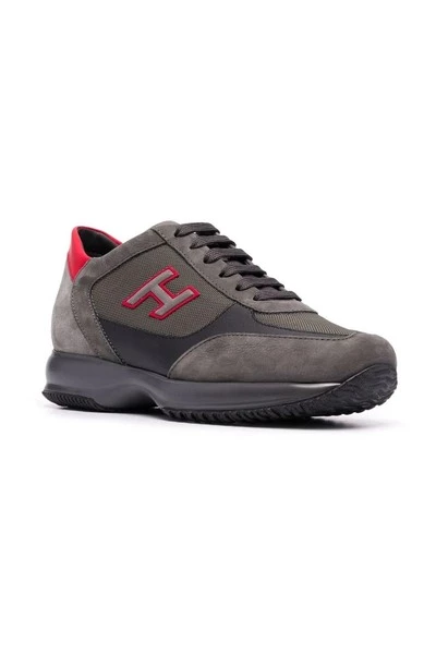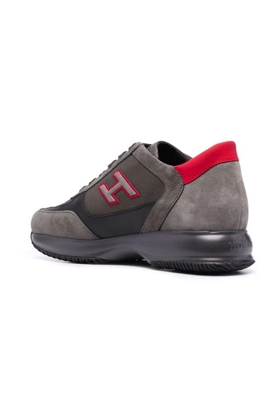 Hogan Sneakers Sneakers Grijs suède en grijze kaki gekenmerkt door een ronde neus, voor sluiting, een ontwerp panelen, logo aangebracht, het achterpaneel contrast en zwarte rubberen zool.